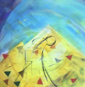 2021Het werk is 90cm x 90 cm Het werk “Ontmoeting” is een schilderij dat van een werkplek een ontmoetingsplek maakt. De abstracte afbeelding is helder en kleurig en zal de collega’s een gevoel geven van herkenning en huiselijkheid. De afbeelding zou het bedrijfsgebouw kunnen voorstellen, geel onder de blauwe lucht. Een dak waaronder diverse mensen, driehoekige elementen, komen en gaan. Waar de gemeenschappelijke geest vaardig wordt en samenwerking bevordert (krul en lemniscaat bovenin).
