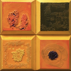 2006geel/zwart/oranje met glassbeads (glasparels) Dit is een kleine uitvoering van een werk van 150 cm x 150cm.